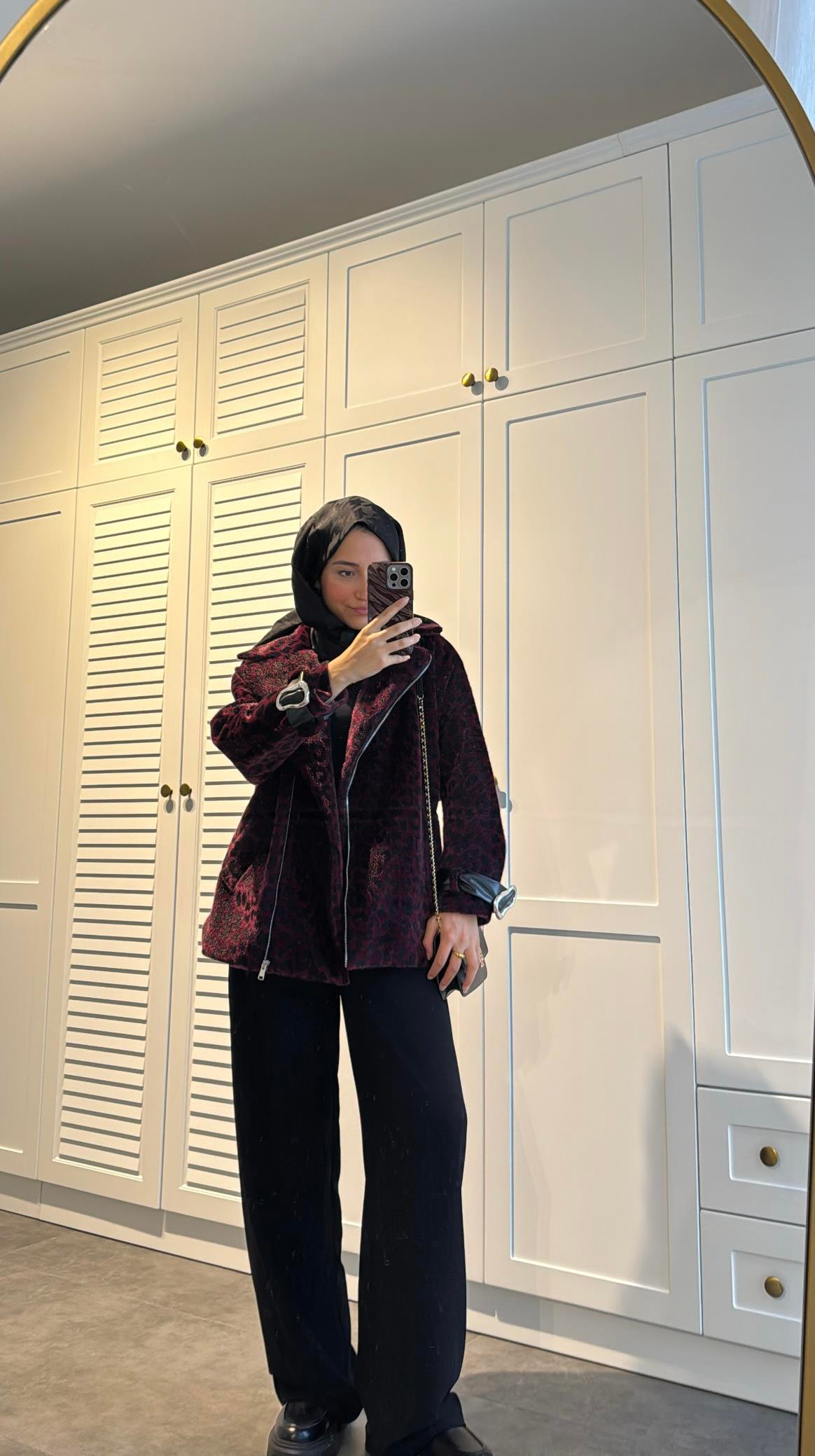 Deri Kemer Detaylı Desenli Ceket Vişne