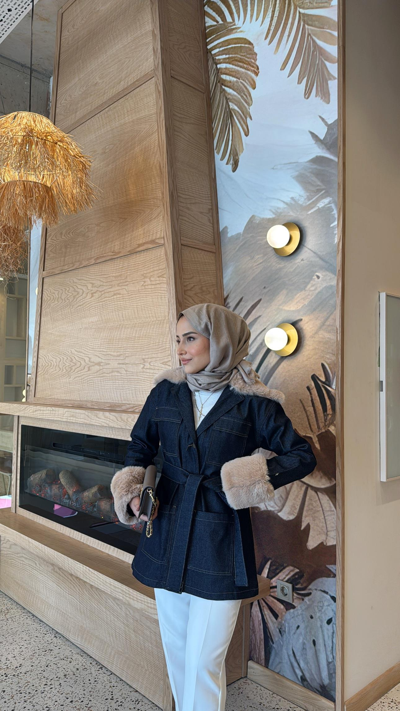 • Kot kumaştır - kollar ve yaka peluş detaylıdır çıkarılabilir - ceplidir - seyyar kuşaklıdır - önden düğmelidir