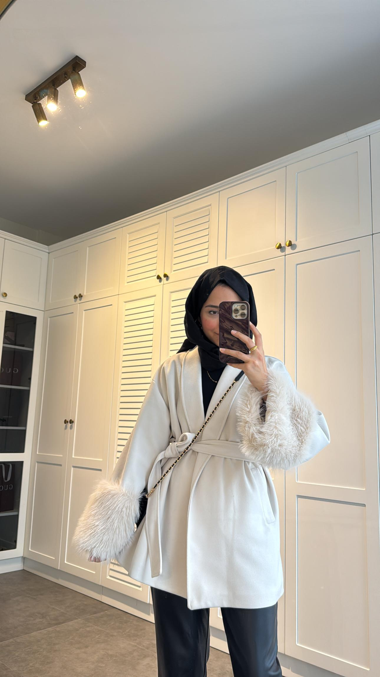 Ürün boyu 75 cmdir. .Kaşe kumaştır,kolunda kürk detayı mevcuttur, içi komple astarlıdır, kemeri bulunur.