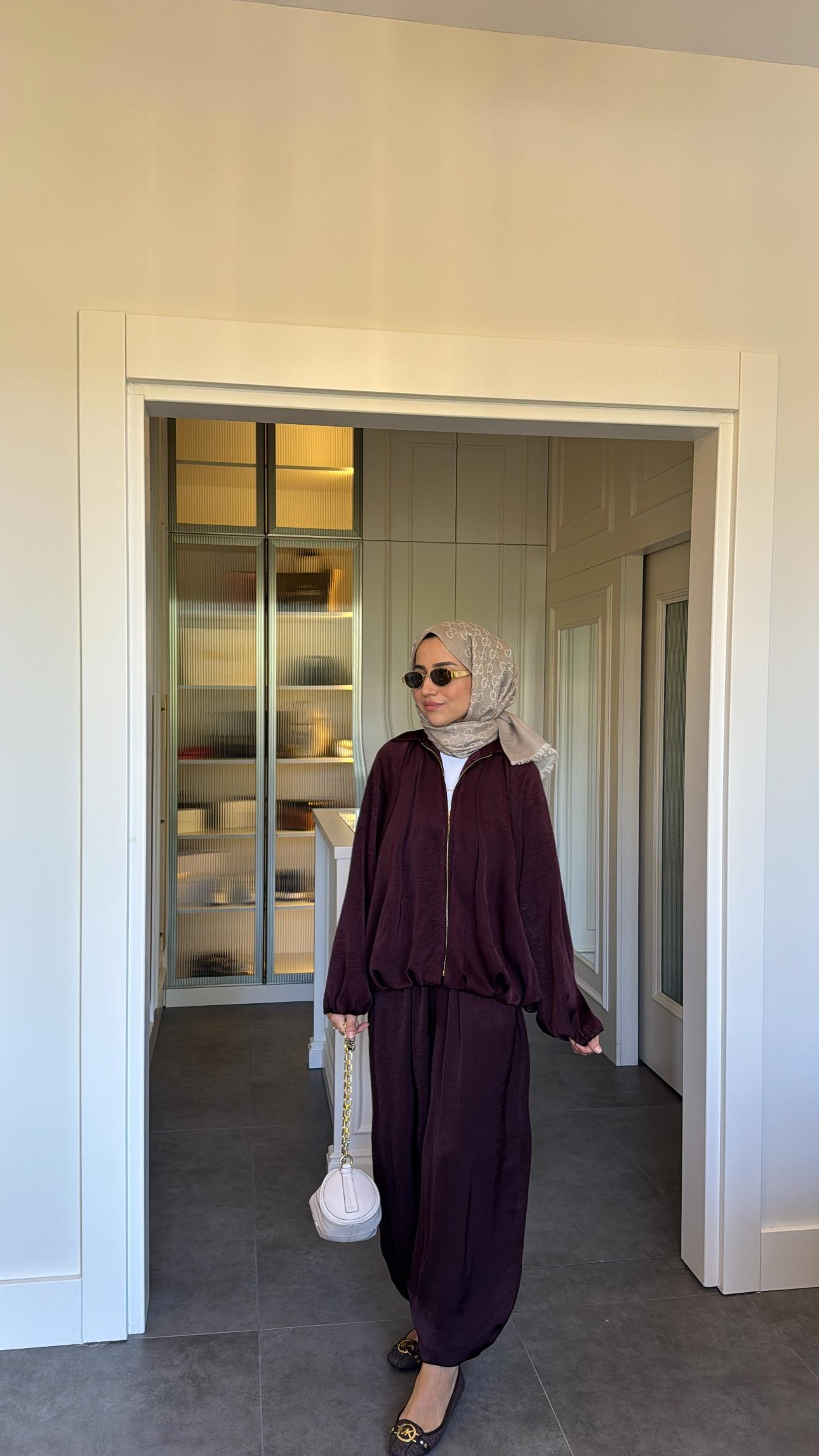 Saten Bomber Ceket Pantolon Takım Mürdüm